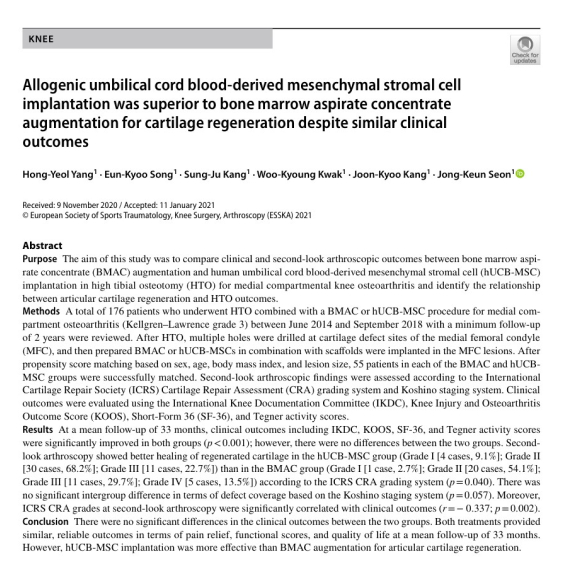 보건복지부에서 무릎 골관절염 환자에서의 골수 흡인 농축물 관절강내 주사를 무릎 관절 통증을 치료하고 기능을 개선함에 있어 안전하고 유효한 기술로 평가했습니다.